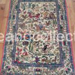 Condition       :  There are no signs of wear and thus has an even pile. There is however a small tear (as opposed to a hole) in the middle of the rug. The colours are still vivid with no signs of fading. The selvedges are fully intact, with no fraying. The silk fringes have been slightly trimmed on one end and at the other, there are some missing fringes. Thankfully the ends remain intact.
